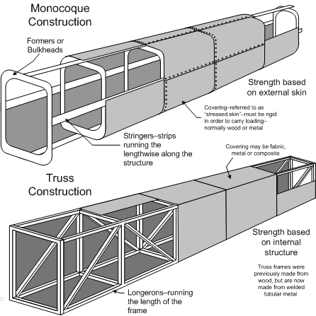 Two types of fuselage construction exist, the first referred to as truss construction, which consists of longerons (tubes running length-wise) that are braced by beams to form a truss. The second is monocoque construction, which entails formers or bulkheads, joined by stringers (strips running length-wise), and surrounded by a stressed skin. The stressed skin is designed to be load-bearing, and it is this feature which differentiates it from traditional truss construction. As part of pilot pre-flight inspection, examination of stressed skin provides indication of the structural soundness of the fuselage.