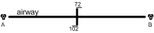 Normally the radio aid used for tracking an airway is changed between the anchoring facilities at the half-way mark. Where this changeover point is different, it is marked as indicated on the right. En route from VOR A to VOR B, the VOR A is selected until the 102-NM mark is reached, and then VOR B is selected.
