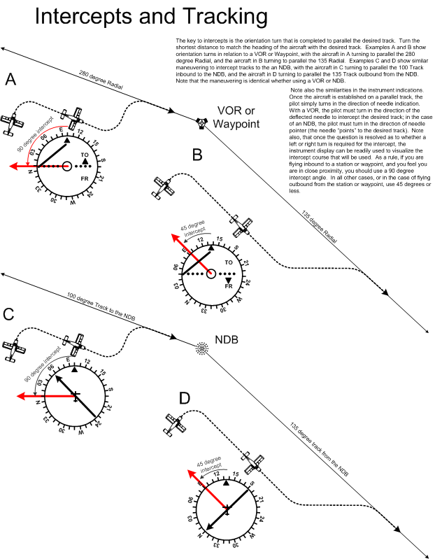 The intercept angles used are the same (unless otherwise prescribed): a 45° angle is used when intercepting a track from a station (radio navigation aid), and a 90° angle is used when intercepting a track to a station.
