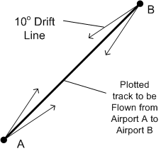 To assist in-flight correction, two drift lines are drawn on the map 10° either side of the track, diverging outward from the set-heading point, and converging into the destination. The length of the drift lines should be sufficient so as to provide position reference at the mid-track point.