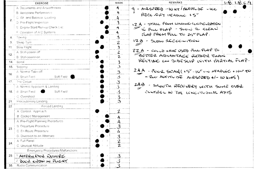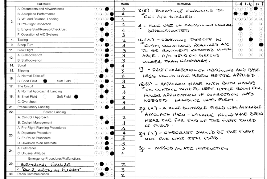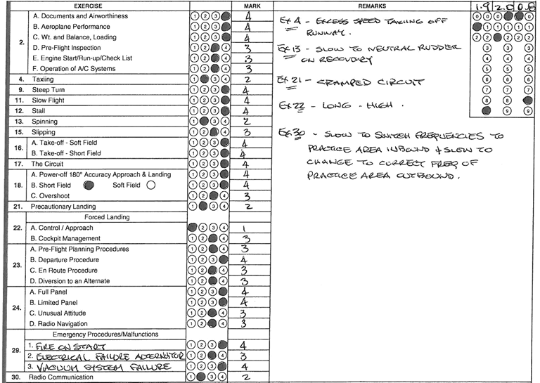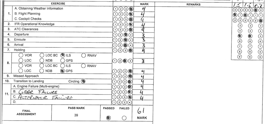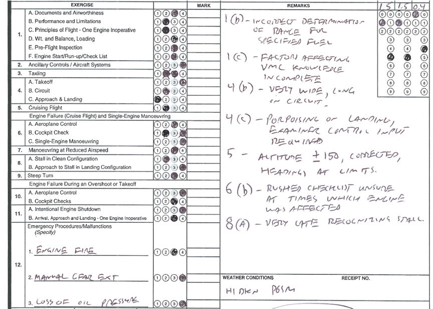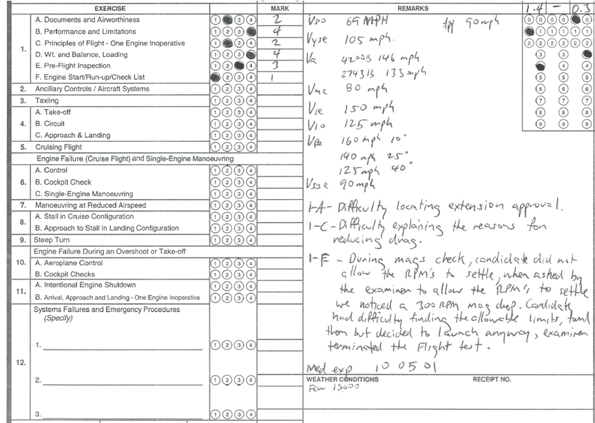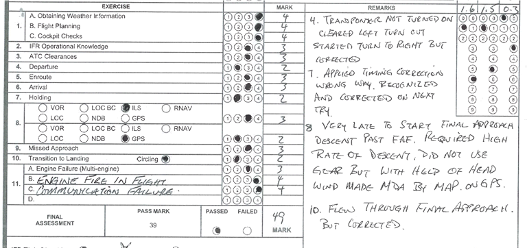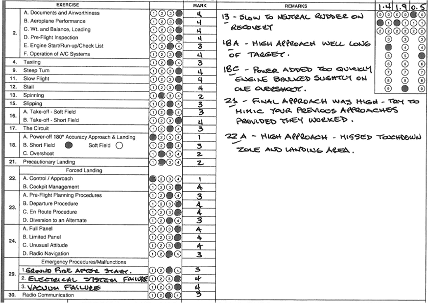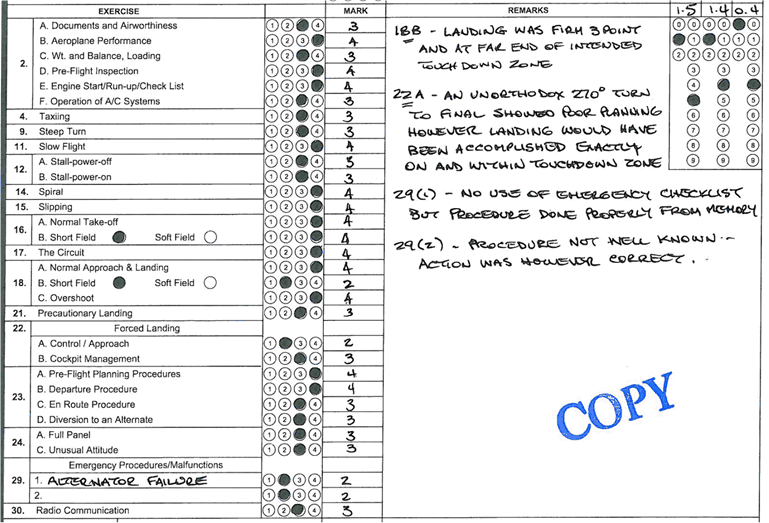 The collection of Flight Test Report samples below are derived from actual flight test results, so you will be reading raw Pilot Examiner notes. The idea, of course, is for you to read the comments of the examiner with the idea that you will know not to display in your own flight test. Unfortunately, the examiner comments are abridged and do not shed a lot of light on what occurred, but there should be enough information for you to get a sense of their general thinking leading to the mark-down. Remember that comments are only provided for scores of 2 or lower (i.e., 1). Therefore, when a candidate does well on an exercise, there will not be any more information other than the score of 3 or 4.