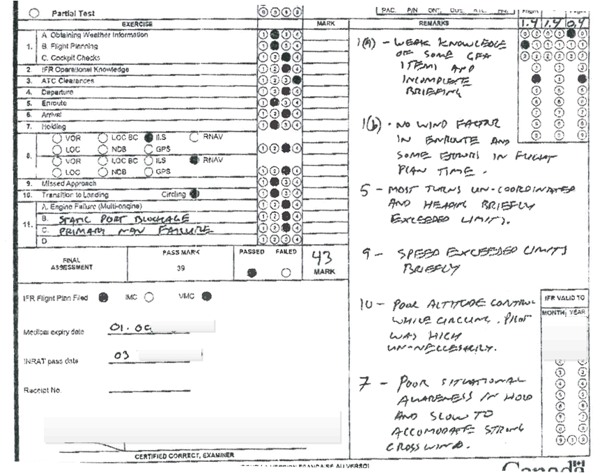 Learn from other students who have gone before you. This is the idea of this page. It is designed to ensure you know the common mistakes that have occured in the past. The idea is that if you are aware of these, you won't repeat them. This page is divided into two parts, the first is based on notes made by Flight Instructors following the debriefing that occurs after a flight test. The second part is comprised of the raw scanned Flight Test Reports (obviously excluding any information that might identify the student) so that you can read the actual comment recorded by the Pilot Examiner on the Flight Test Report that is submitted to Transport Canada.