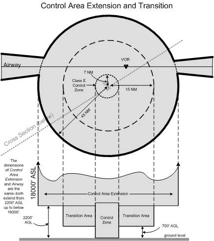 - A Control Area Extensions serves the same purpose as Transition Areas (containing IFR aircraft during arrivals and departure procedures)—except they are designed to cover a wider area. They are always based at 2,200’ AGL’ and extend up to but not including 18000’ ASL (unless otherwise indicated).
