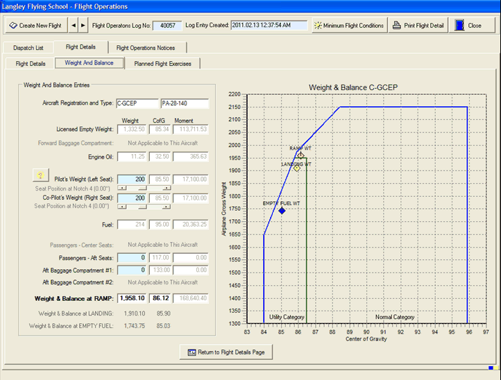 The screen below is part of the technical dispatch data inputs by students and displays the critical weight and balance data for the aircraft, including its centre of balance point (centre of gravity) as well as in takeoff and landing weight. The zero-fuel centre of gravity point is also displayed.