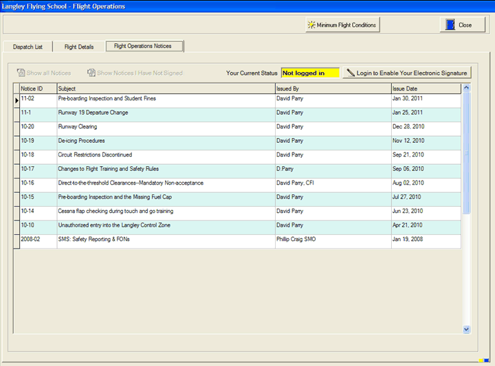 A critical feature of Pilotlog with respect to operation safety is the read-and-sign feature referred to as Flight Operations Notices. When changes in operational procedures are made, or when safety related information must be disseminated to all students, the Flight Operations Notices feature ensures that all student have read and signed published notices prior to conducting their next training flight. The screen image below is the access screen to current FONs, and the student is prevented from signing out a aircraft for a training flight unless there is an electronic signature on record for all current notices.